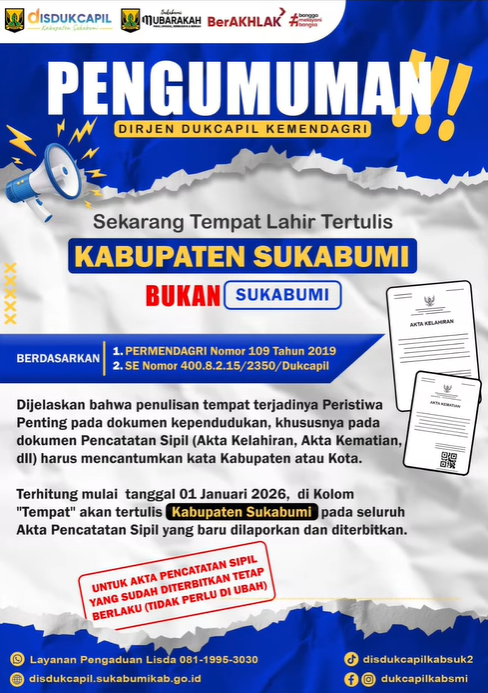 Sejalan dengan ketentuan tersebut, terhitung mulai 1 Januari 2026, pada kolom “Tempat” dalam seluruh Akta Pencatatan Sipil yang baru dilaporkan dan diterbitkan di wilayah Kabupaten Sukabumi akan tertulis secara lengkap “Kabupaten Sukabumi”.
