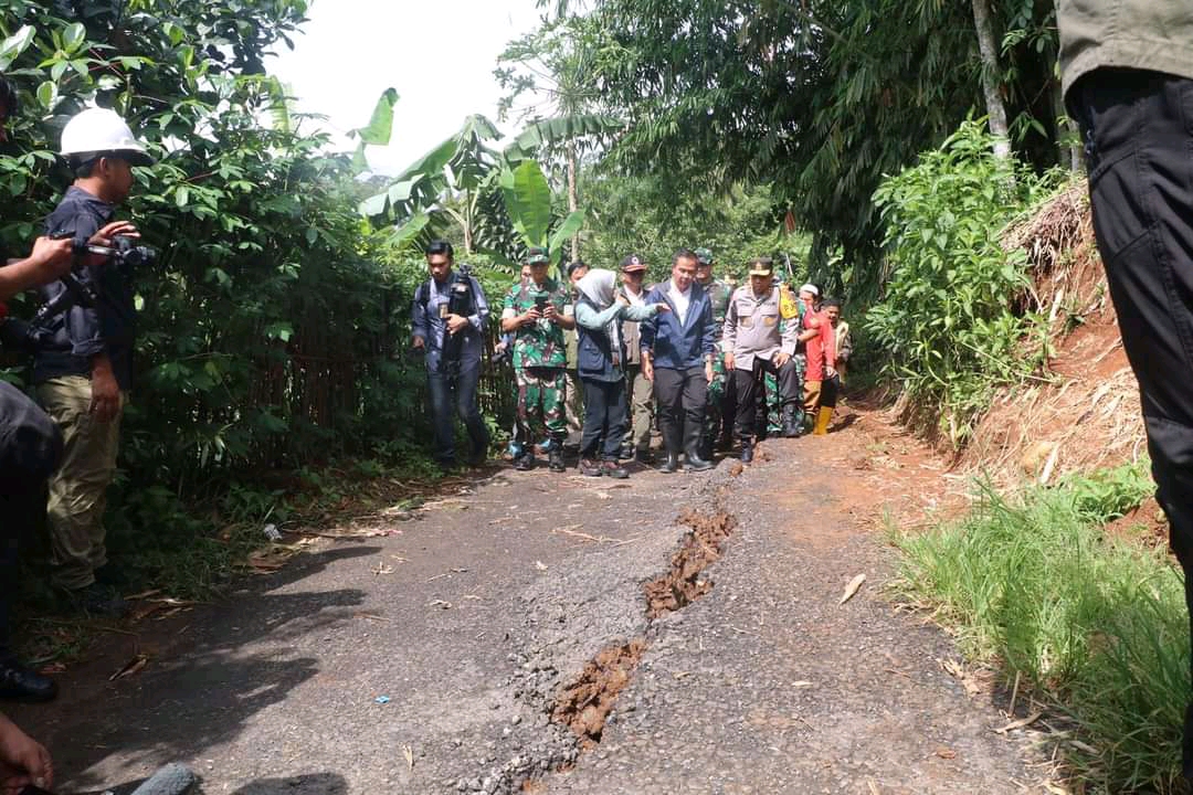 tatarpasundannews.com-sukabumi, Bupati Sukabumi H. Marwan Hamami mendampingi Pj Gubernur Jawa Barat Bey Machmudin meninjau lokasi bencana pergerakan tanah di Desa Sukamaju, Kecamatan Cikembar, Kabupaten Sukabumi, Kamis, 5 Desember 2024.
