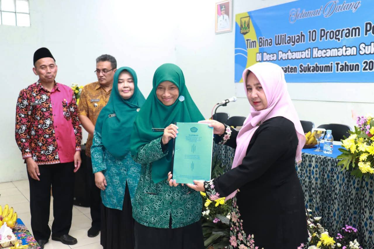 Dalam kesempatan tersebut TP PKK Kabupaten Sukabumi menyerahkan bantuan ATK kepada TP PKK Desa Perbawati serta menerima laporan pelaksanaan kegiatan bina wilayah (Binwil) 10 Program PKK dari TP PKK Kecamatan Sukabumi